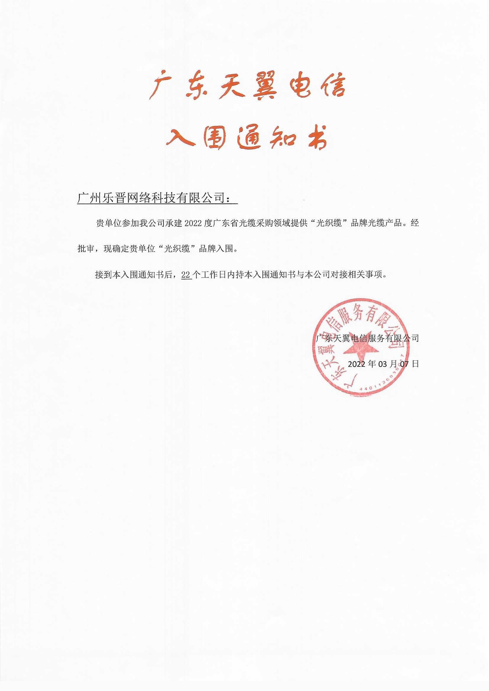 2022年廣東天翼電信服務有限公司光織纜光纖光纜入圍通知書